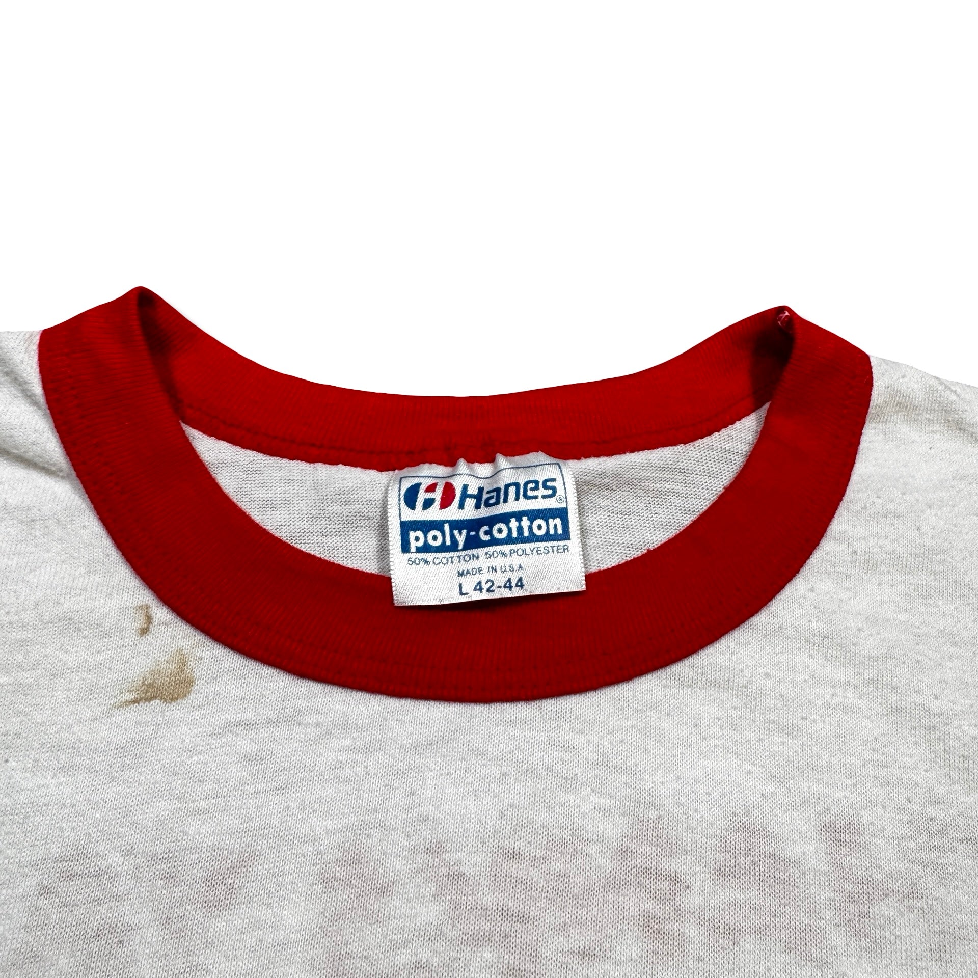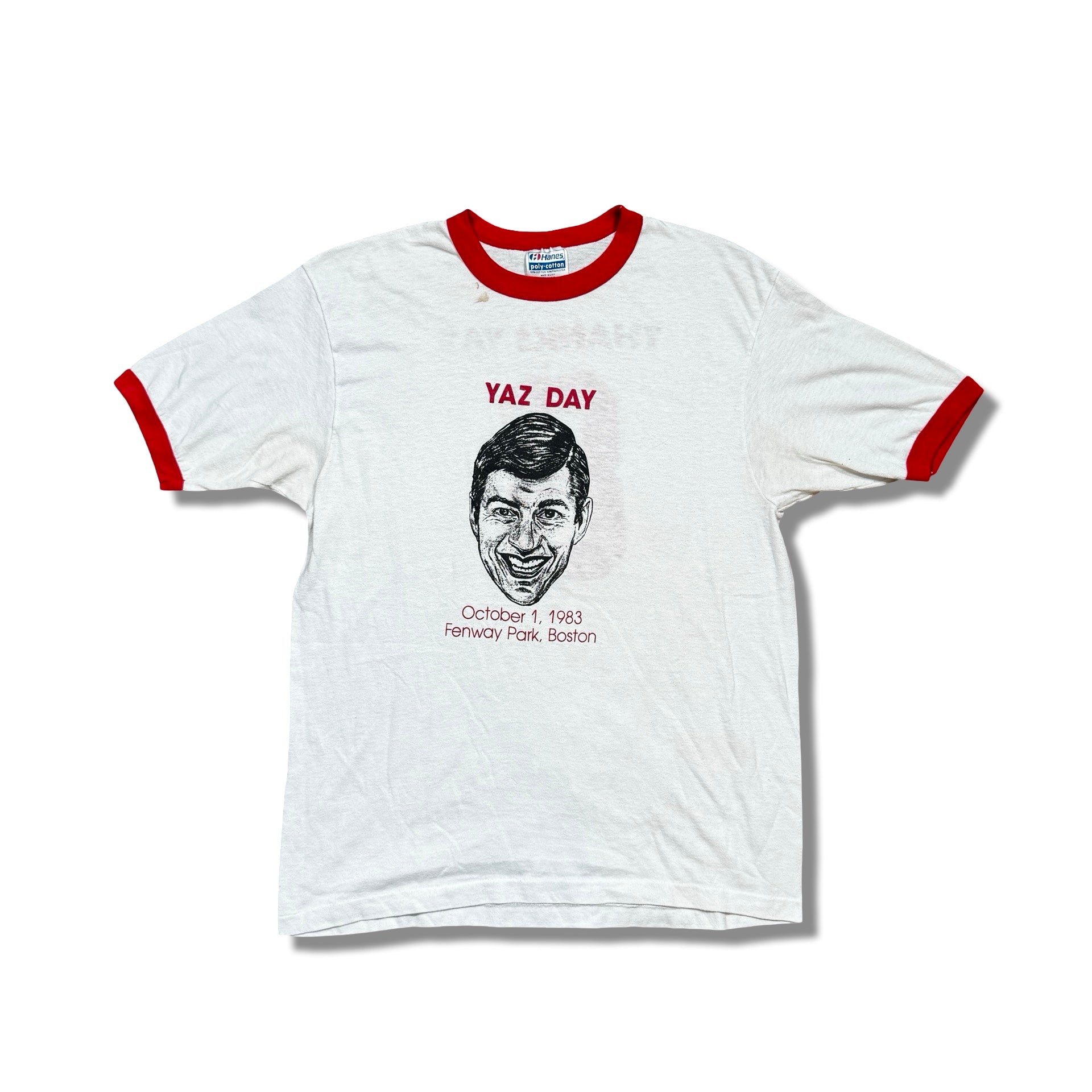 This rare vintage ringer tee was made for “Yaz Day” on October 1, 1983, at Fenway Park in Boston, honoring Red Sox legend Carl Yastrzemski’s retirement. Featuring a bold black-and-white illustrated portrait with “YAZ DAY” text above and event details below, the shirt is finished with red ringer collar and sleeve cuffs. A true piece of baseball and Boston sports history. Shows a light stain on the upper front near the collar, consistent with its age and authentic wear.