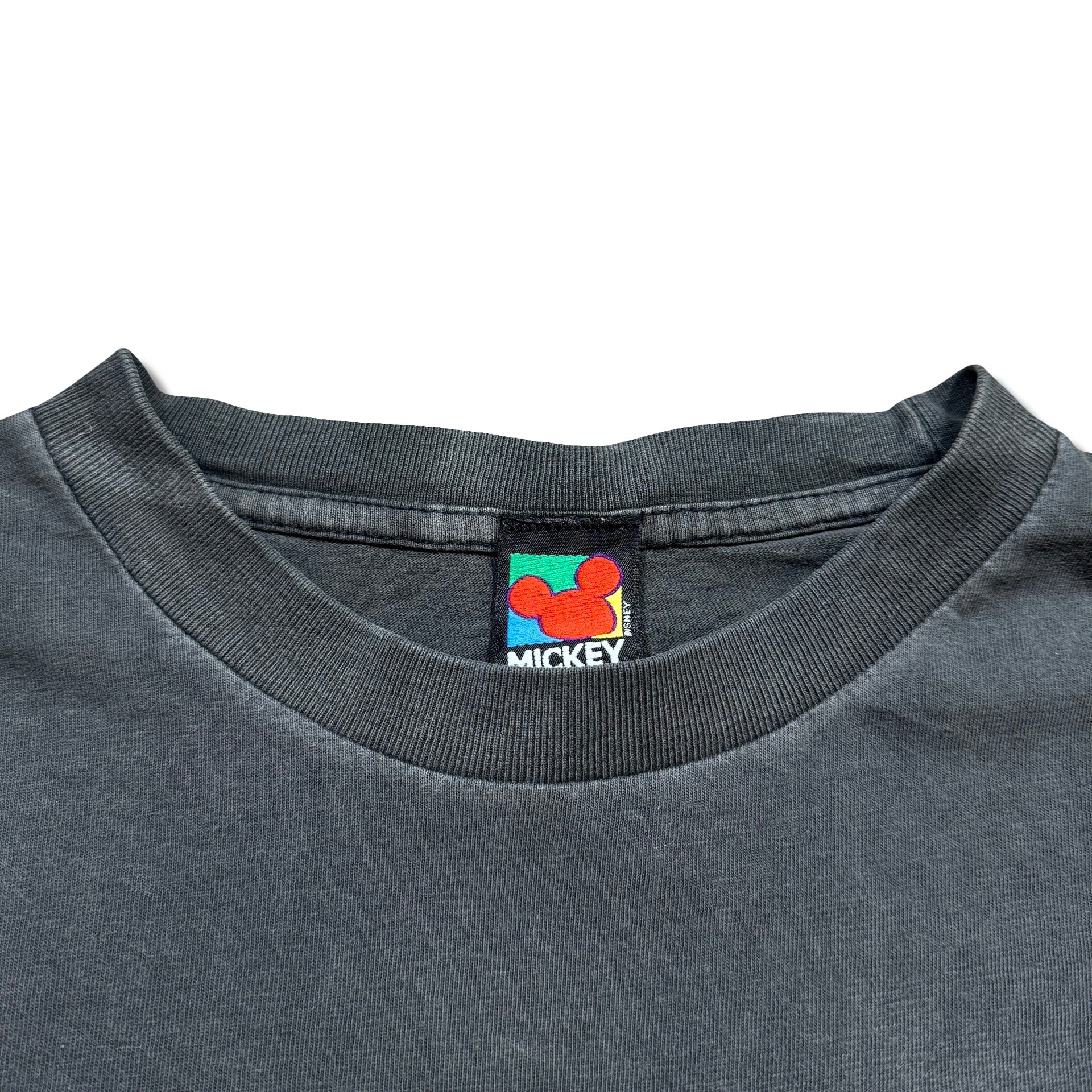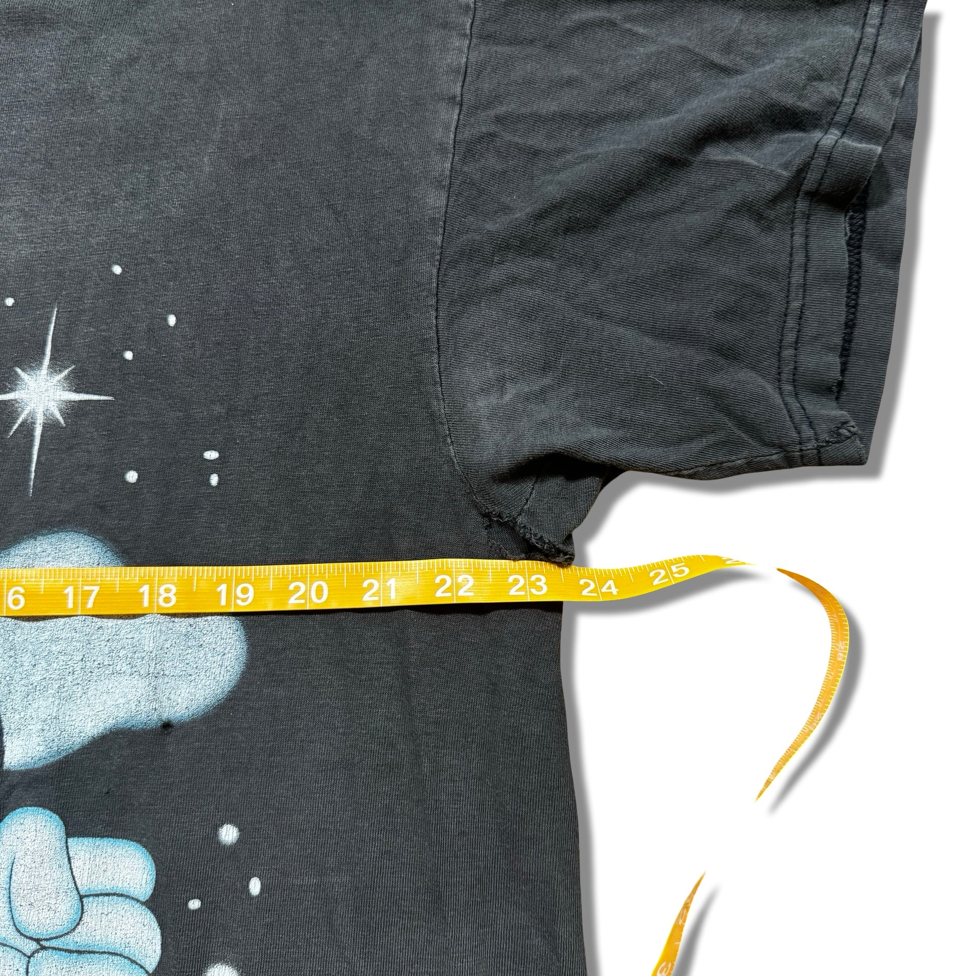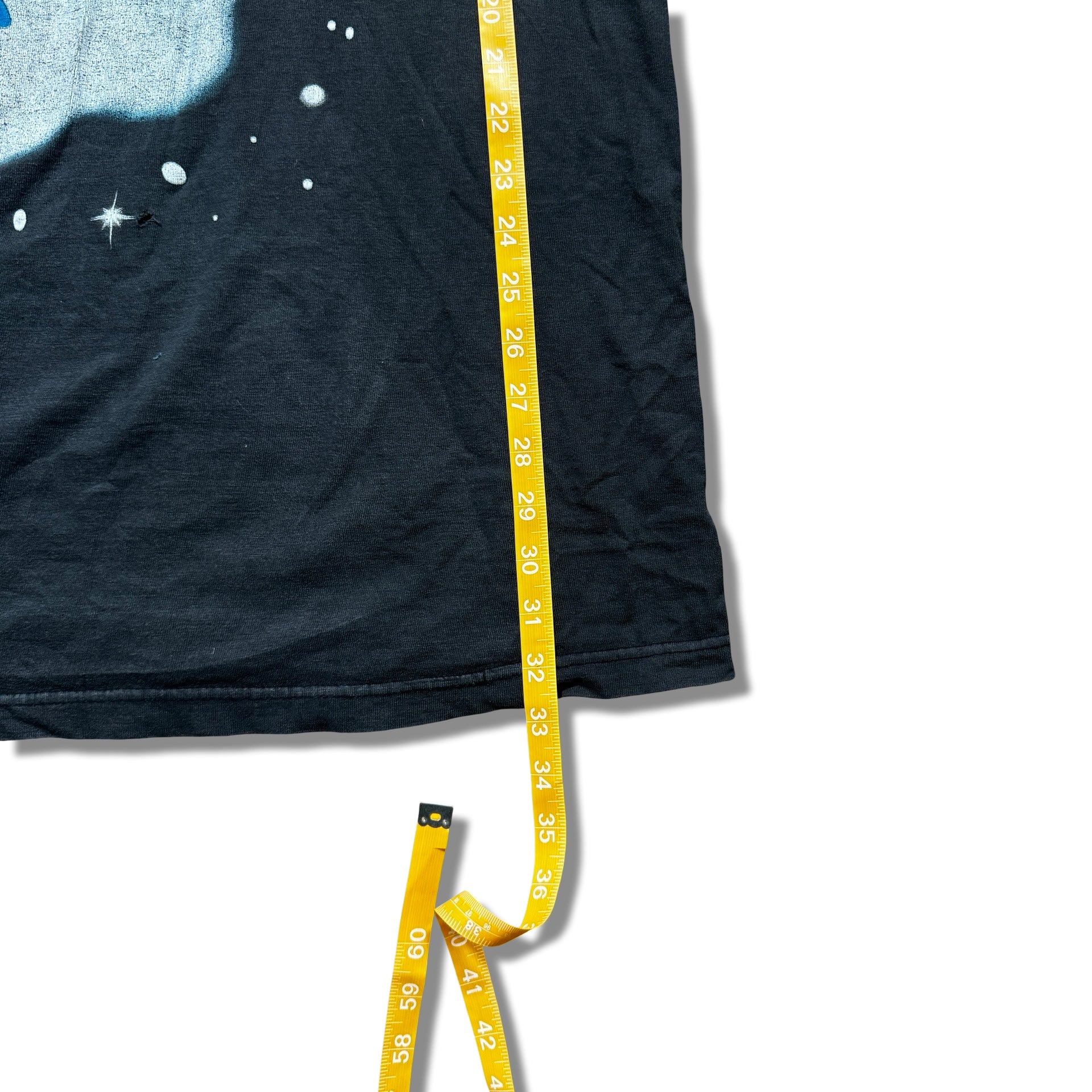 This vintage Disney sleep shirt features Mickey Mouse in a whimsical nighttime scene, complete with striped pajamas, a blue sleeper cap, and cozy bunny slippers. Set against a cloud-and-star background on soft black cotton, this shirt has the relaxed, playful vibe of ’90s Disney apparel. The fabric has natural fading and some holes, adding authentic vintage character and charm to the piece.
